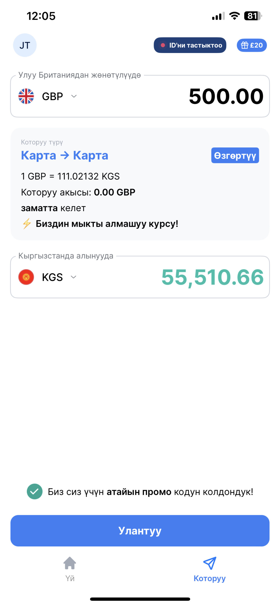 Борбор Азияга көпчүлүк которуулар акысыз! Биз дароо карта которууларына, банк которууларына жана кийинки күнү которууларга эч кандай акы кошпойбуз. Алуучу биздин колдонмо сизге көрсөткөн так сумманы алат. Жашыруун акылар жок, таң калтырган жагымсыз күтүүлөр жок.